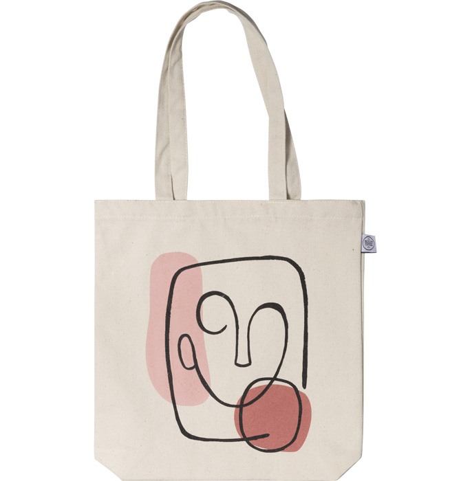 – Beige stofpose med abstrakt illustration, der forestiller et ansigt og to figurer, trykt på forsiden