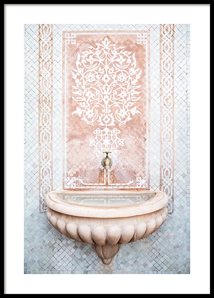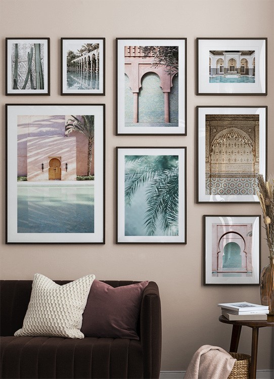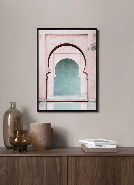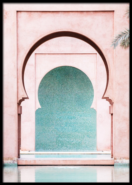 Handpicked Fotografi af en lyserød væg med runde buer og en blå væg i baggrunden. Vi bliver aldrig trætte af arkitektur i pastel! Dette foto fremhæver skønheden og mystikken ved Marrakech ved at vise os svundne tiders arkitektur skabt med en fantastisk detaljerigdom. Denne plakat er en del af Studio Amara – en fotokollektion fotograferet af Desenio Design Studio i Marrakech.