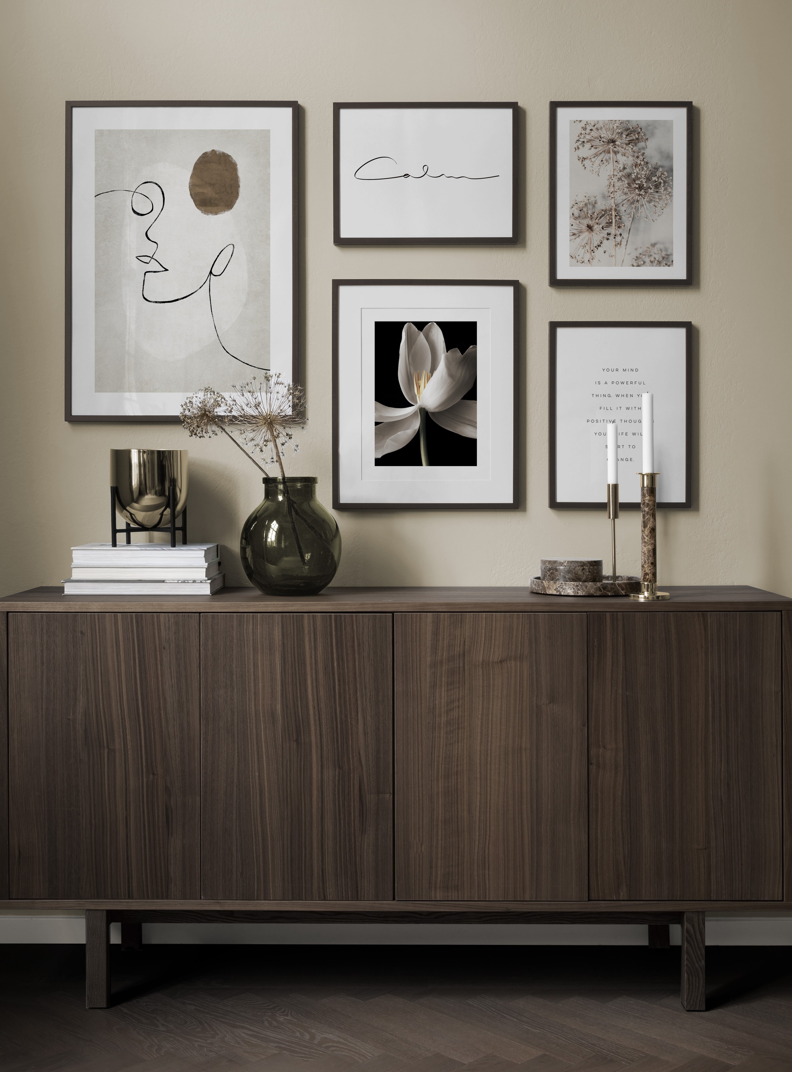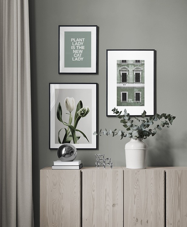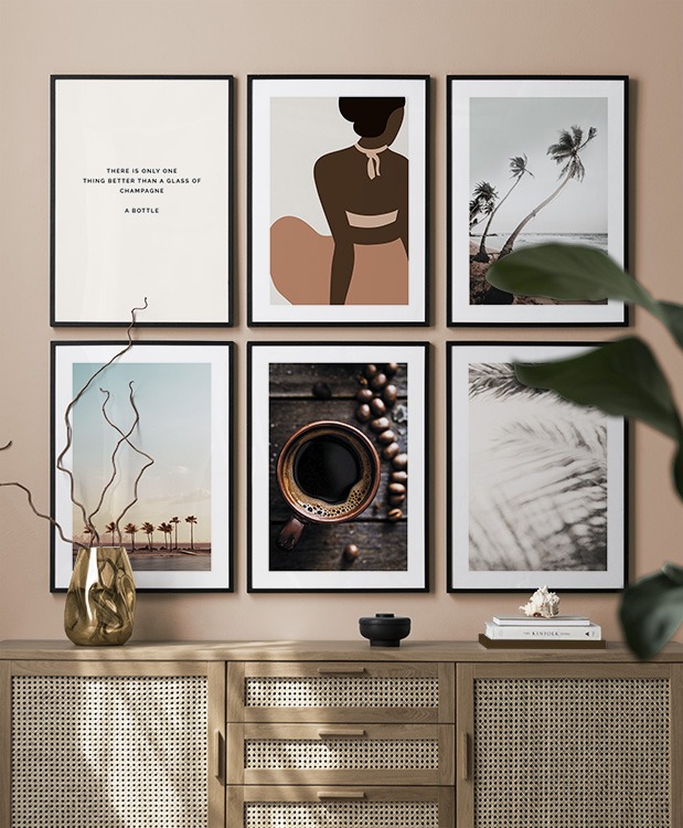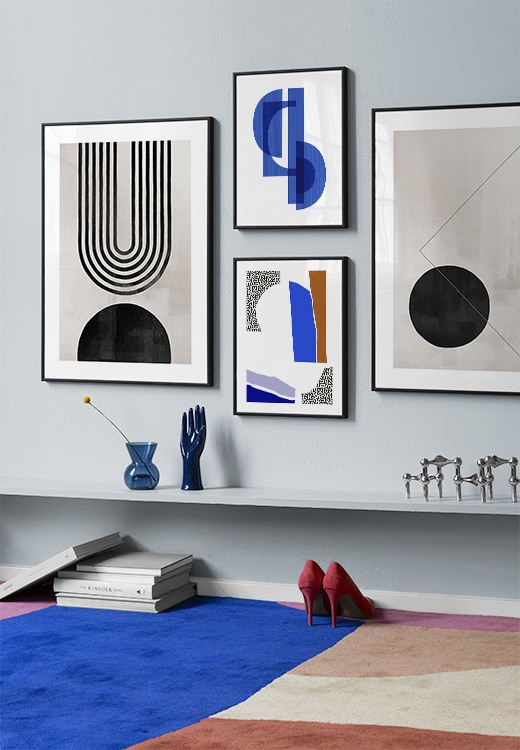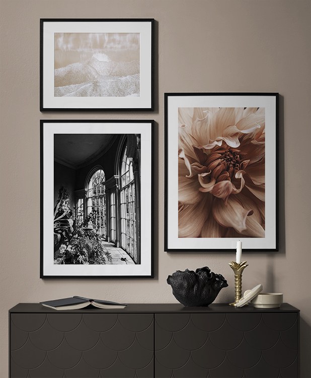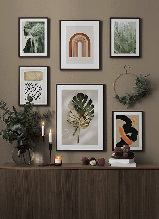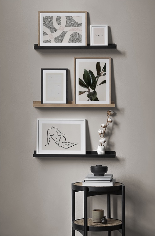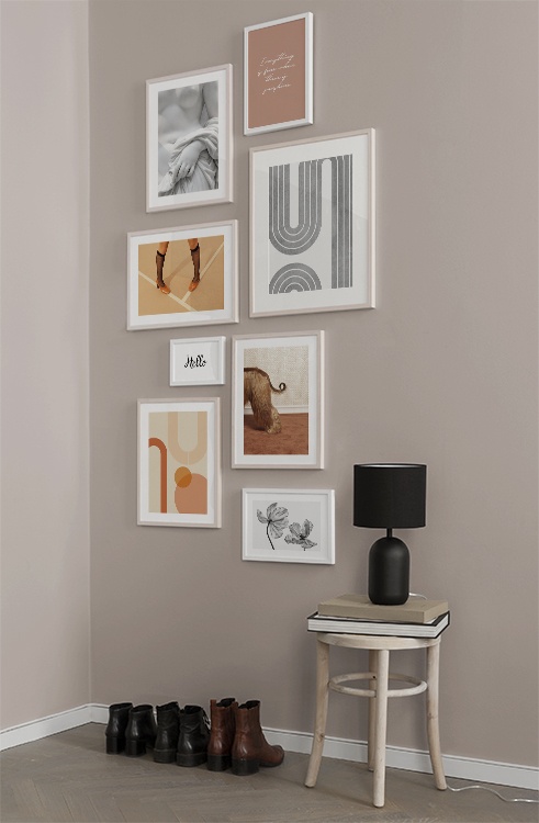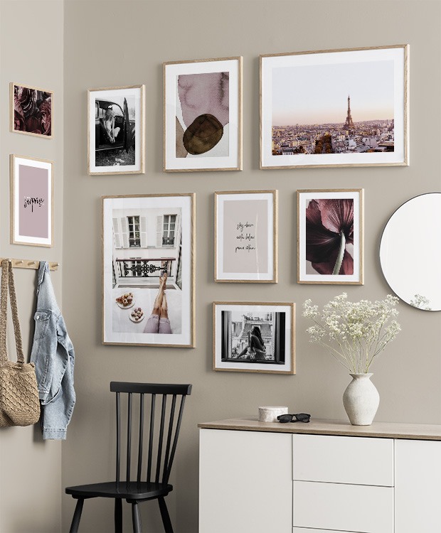 Et af vores bedste tips er at bruge opbevaringsløsninger til at placere kunst på, så du ikke altid et nødt til at bore i væggene! Sæt billederne på kommoden eller bænken, så de læner mod væggen, og opbyg et smukt stilleben omkring kunsten. På den måde er det nemt at variere indretningen i entréen og tilpasse den årstiden og humøret! Hvis du foretrækker at hænge din kunst op, kan du bygge en moderne billedvæg, der passer til både små og store entrévægge.