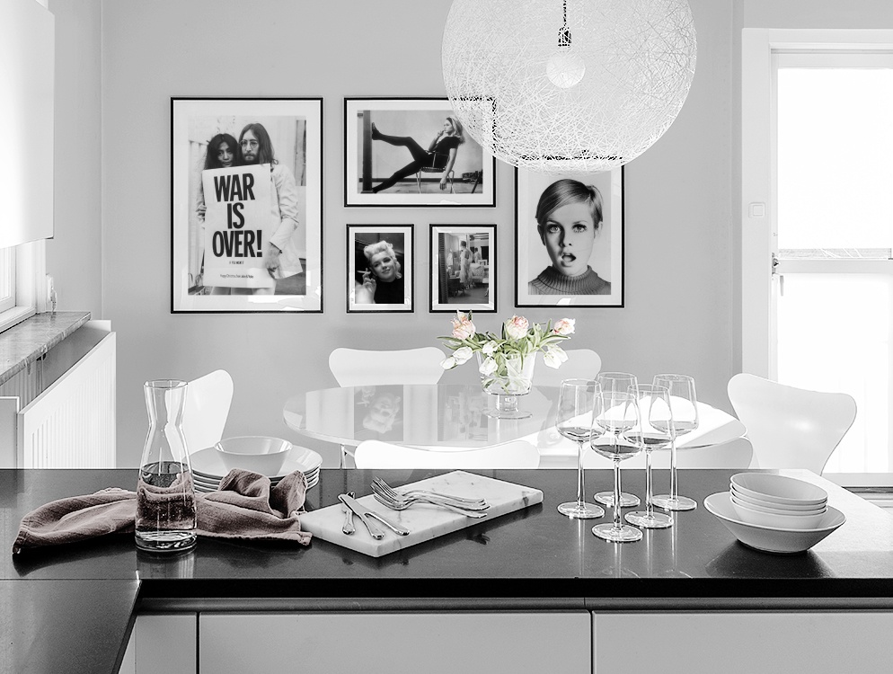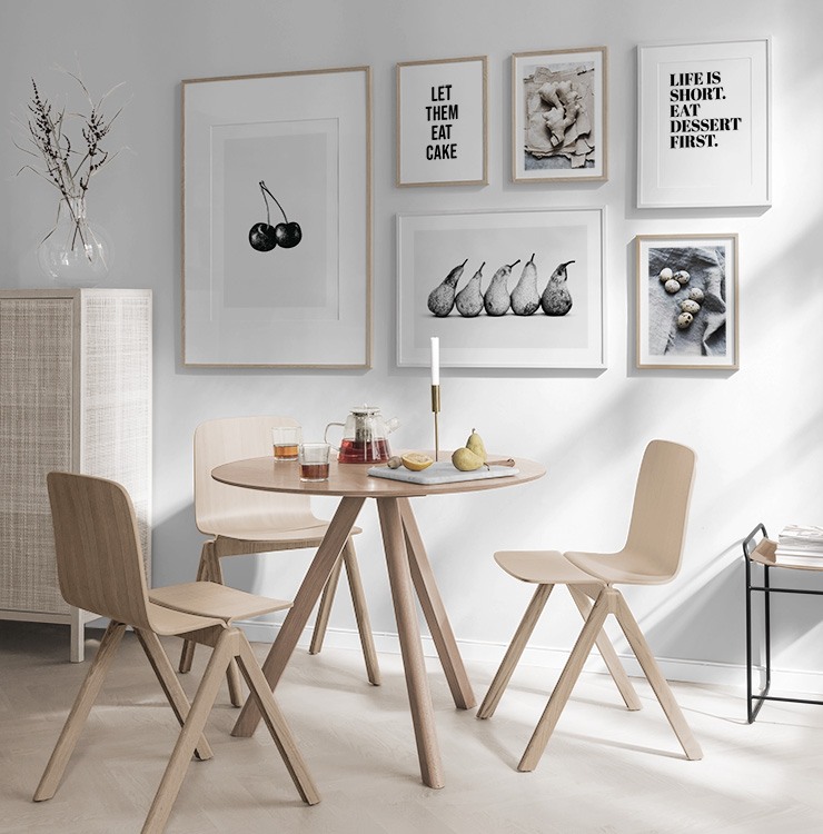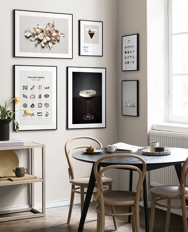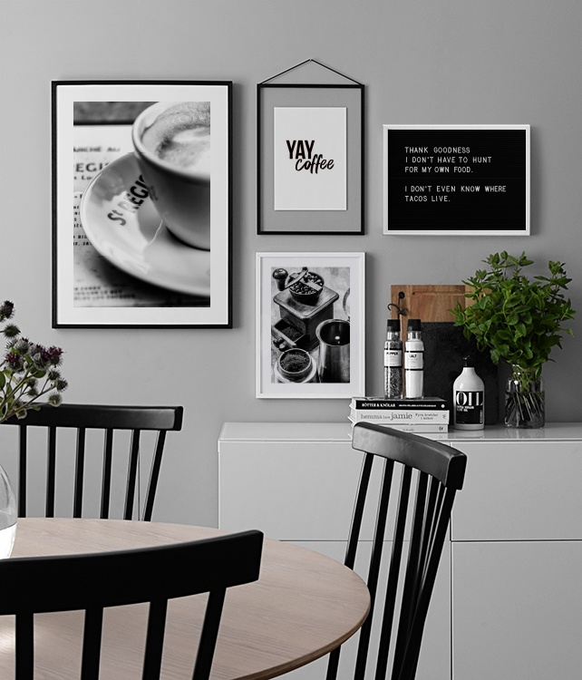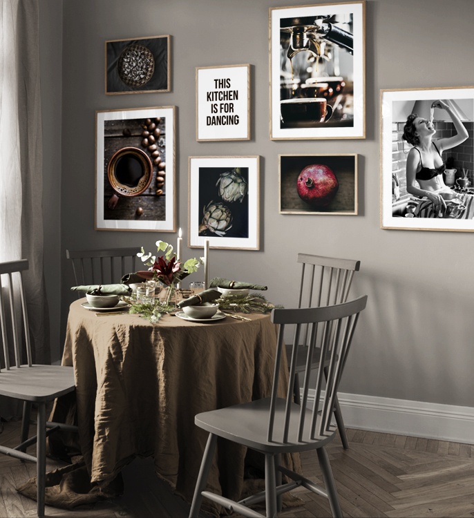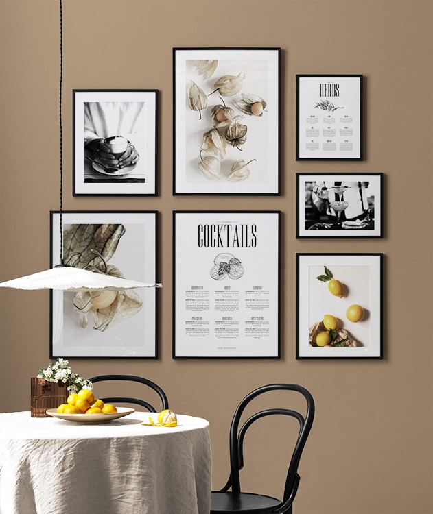 Brug af kunst i køkkenet er en prisbillig og effektiv måde at opdatere dine køkkenvægge på og give dem et mærkbart løft. Her komponerer og sammensætter vi vores forskellige plakater og motiver, der passer perfekt til køkkenet eller spisestuen. I køkkenet bruger vi gerne plakater og design, der går hånd i hånd med køkkentemaet, såsom fotografier af friske krydderurter, en opskrift på en lækker cocktail eller et dejligt citat.
