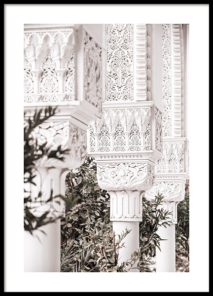 Handpicked Fotografi af en hvid, oval bue med detaljer udskåret i hånden og en sort dør. De fascinerende detaljer i Marrakechs arkitektur og al den historie, den rummer, betager os. Denne poster er en del af Studio Amara – en fotokollektion fotograferet af Desenio Design Studio i Marrakech.