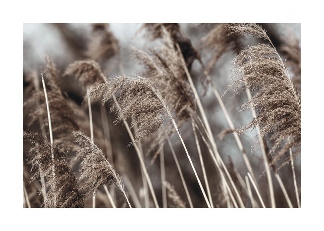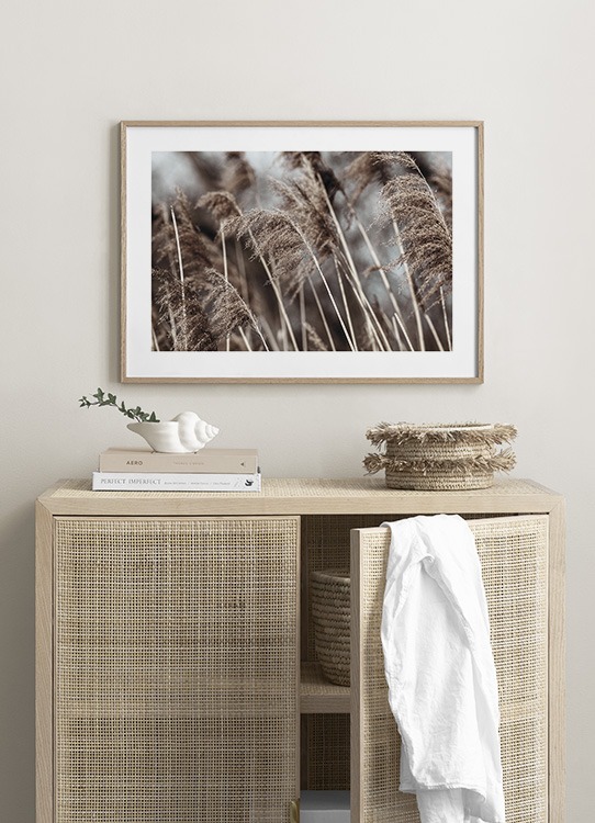 Handpicked Fotografi af beige, tørret græs på en sløret baggrund. Trenden med tørret græs går ingen steder, og hvis du har tørret græs i en vase på sofabordet, kan du kombinere det med matchende plakater og posters.