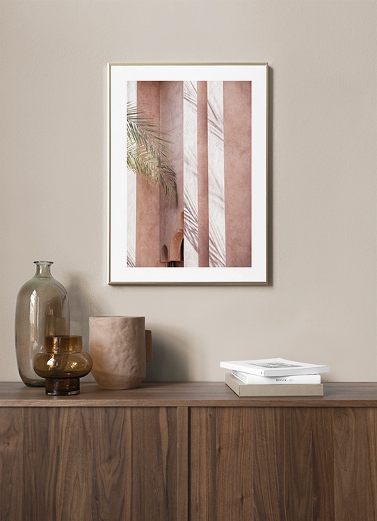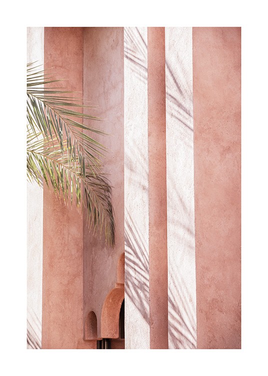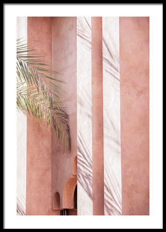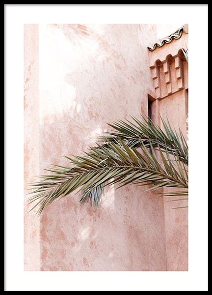 Handpicked Fotografi af skygge på en lyserød bygning med store palmeblade i venstre side. Med lyse og farverige plakater og posters kan du få hjemmet til at føles som nyt på et par sekunder! Denne poster er en del af Studio Amara – en fotokollektion fotograferet af Desenio Design Studio i Marrakech.
