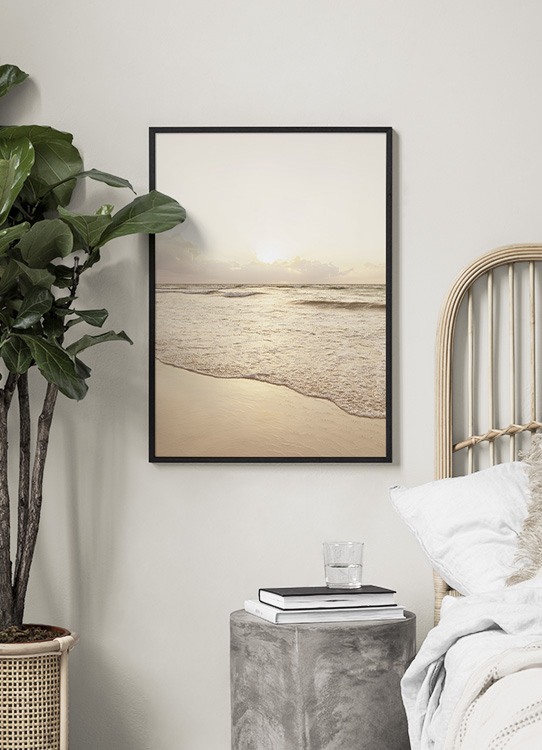 Handpicked Fotografi af et hav og en strand med beige sand i den gyldne time. Ved at hænge plakater i varme nuancer med fredfyldte naturmotiver på væggene vil du mærke roen falde på dig. Naturplakater er også en god stil, hvis du vil ønsker en afslappet stemning i hjemmet, og du kan finde flere plakater og posters i vores kategori Naturmotiv.