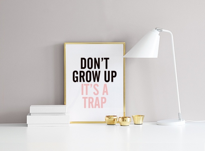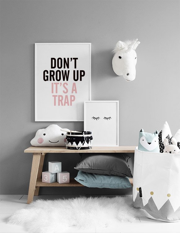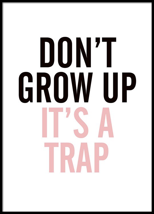 Fra 45,50 kr.En sjov plakat med teksten Don't grow up it's a trap i sort og lyserød. En tekst, som vi alle kan relatere til. Passer perfekt i børneværelset!
