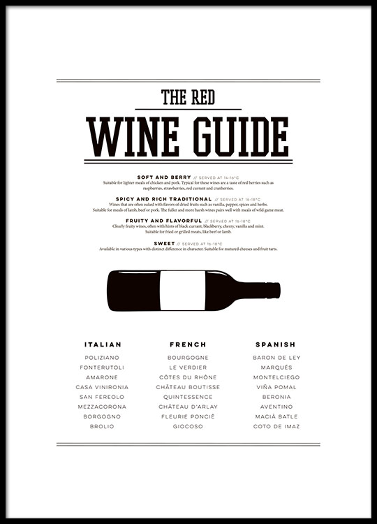Fra 125,30 kr.Plakat med vinguide for rødvine. Plakat, som passer perfekt til køkkenet og matcher med vores andre køkkenplakater, Beef og lamb cuts! Denne køkkenplakat passer super godt i en sort eller hvid plakatramme og bør kombineres med flere af vores plakater med køkkenmotiver. En moderne plakat, som giver dit køkken lidt af et pift. Trykt på ubestrøget kraftigt papir af høj kvalitet.