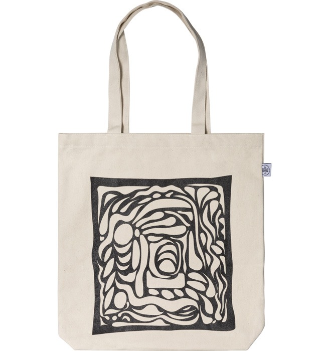 – Beige stofpose med abstrakt illustration i sort trykt på forsiden