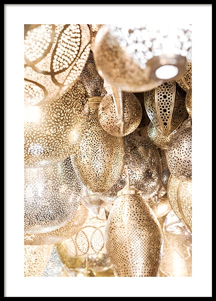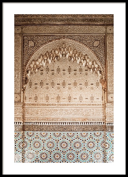 Handpicked Fotografi af en gylden bue med udskårne detaljer i et tempel. Dette sted er i sandhed magisk med sine mange detaljer, der er skabt med stor kunstfærdighed. Denne poster er en del af Studio Amara – en fotokollektion fotograferet af Desenio Design Studio i Marrakech.