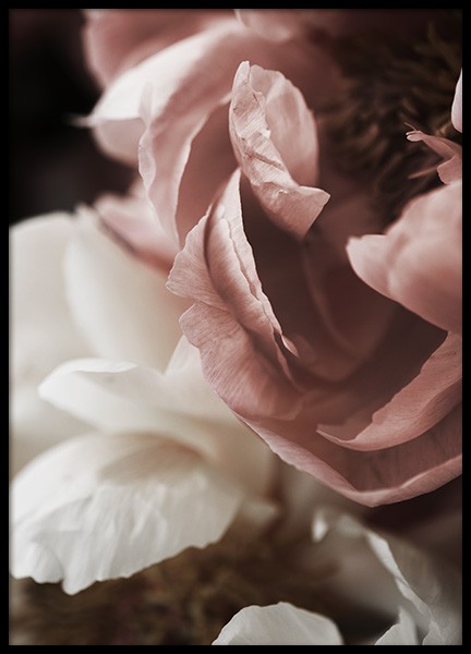 Fotografi af to store, lyserøde pæoner på en mørkegrå baggrund. Botaniske plakater og posters er en god tilføjelse til rum i hjemmet, hvor du gerne vil skabe en varm og indbydende atmosfære. Botaniske elementer vil tilføre et frisk pust og en stemning, der emmer af mindfulness, og de lyserøde nuancer skaber et afdæmpet udtryk.