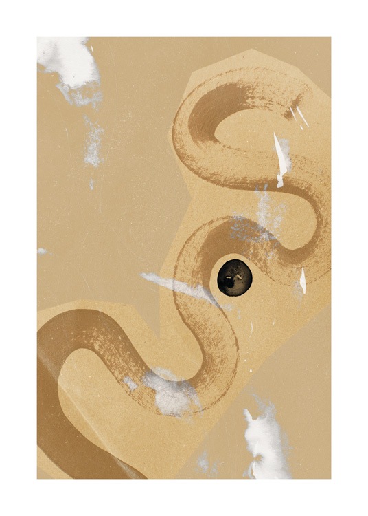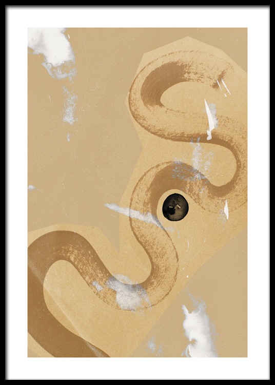Handpicked Abstrakt maleri med hvide og sorte pletter og et brunt penselstrøg, der slynger sig på en beige baggrund med en spættet struktur. Ved at sammensætte plakaten med posteren Umber Abstraction No2 får du et perfekt par!