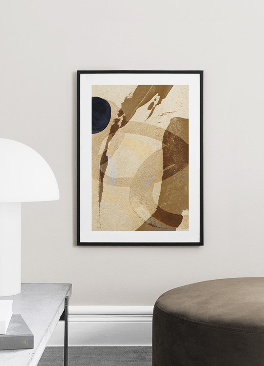 Handpicked Abstrakt maleri med beige og brune penselstrøg og en sort cirkel mod en beige baggrund med spættet struktur. Sammensæt denne moderne og jordfarvede plakat med posteren Umber Abstraction No1 for at få et matchende sæt!