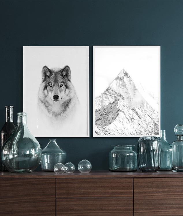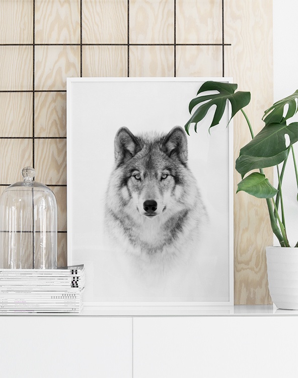 Handpicked Flot sort-hvid fotoplakat med dyremotiv. Denne plakat med fotografi af en ulv på en hvid baggrund er let at kombinere med lignende sort-hvide plakater og dyreposters med populære motiver af vilde dyr. Plakaten passer lige så godt til børneværelset som til stuen med en enkel ramme i sort eller hvid. Fotograf: Jim Cumming