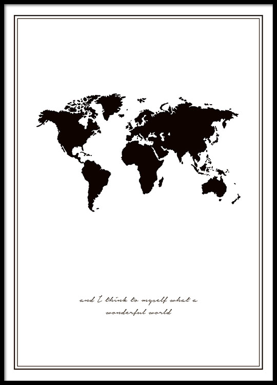 Fra 45,50 kr.Sort-hvid plakat med verdenskort og tekst fra sangen Wonderful world. Utrolig fin og passer perfekt i en sort ramme - eller lige den ramme, du foretrækker. Kan også hænges op med klemmer for et trendy look. Vi har flere verdenskort i forskellige stilarter - se under kategorien Kort og byer. Plakaten er med ''indbygget'' passepartout, som rammer motivet fint ind.
