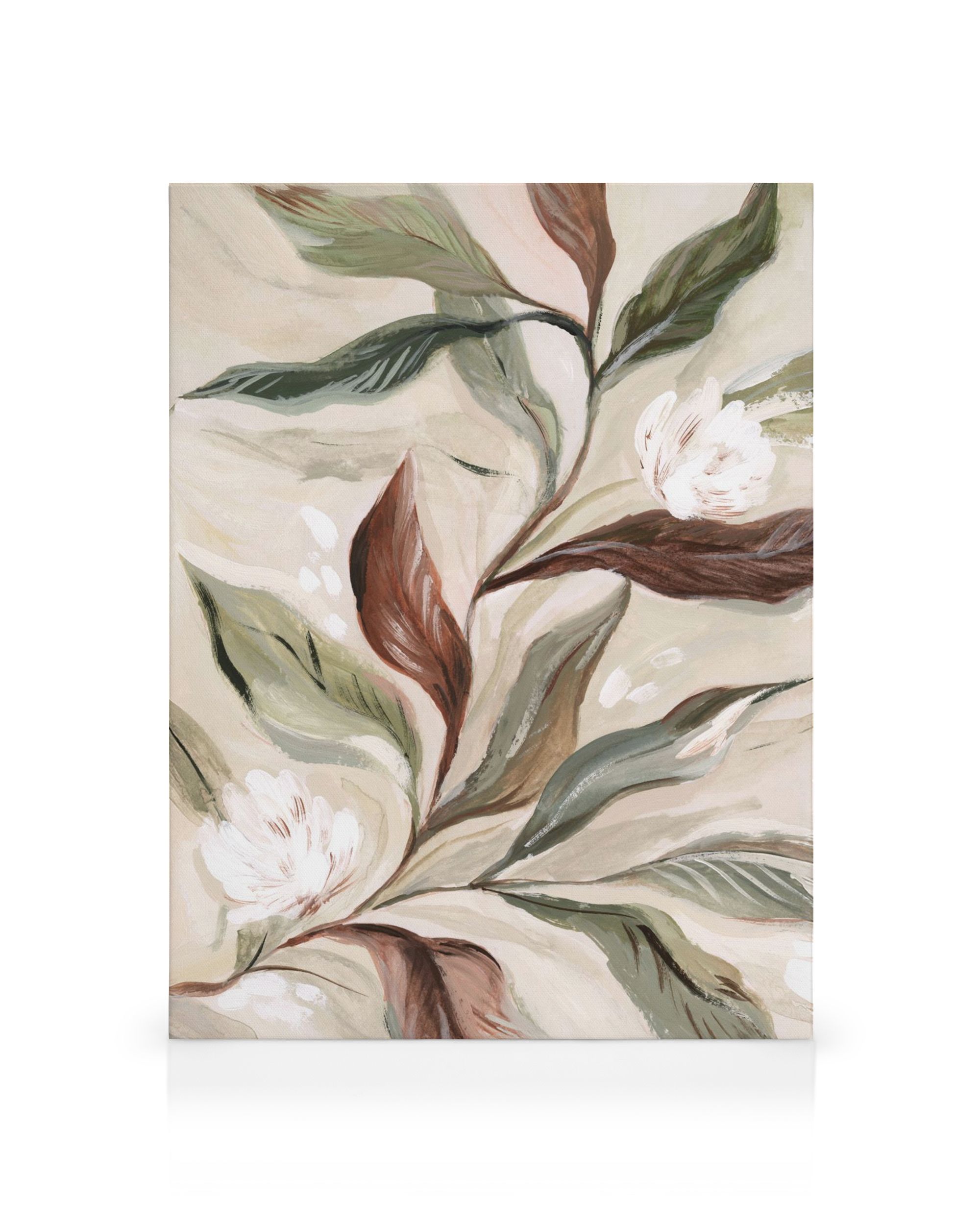 Fra 64,80 kr.Et lærred med botanisk motiv i rustikke farver. Bløde grønne og brune blade er malet med delikate penselstrøg, mens hvide blomster smelter elegant ind i den lyse baggrund. Dette lærred skaber en naturlig og rolig stemning.