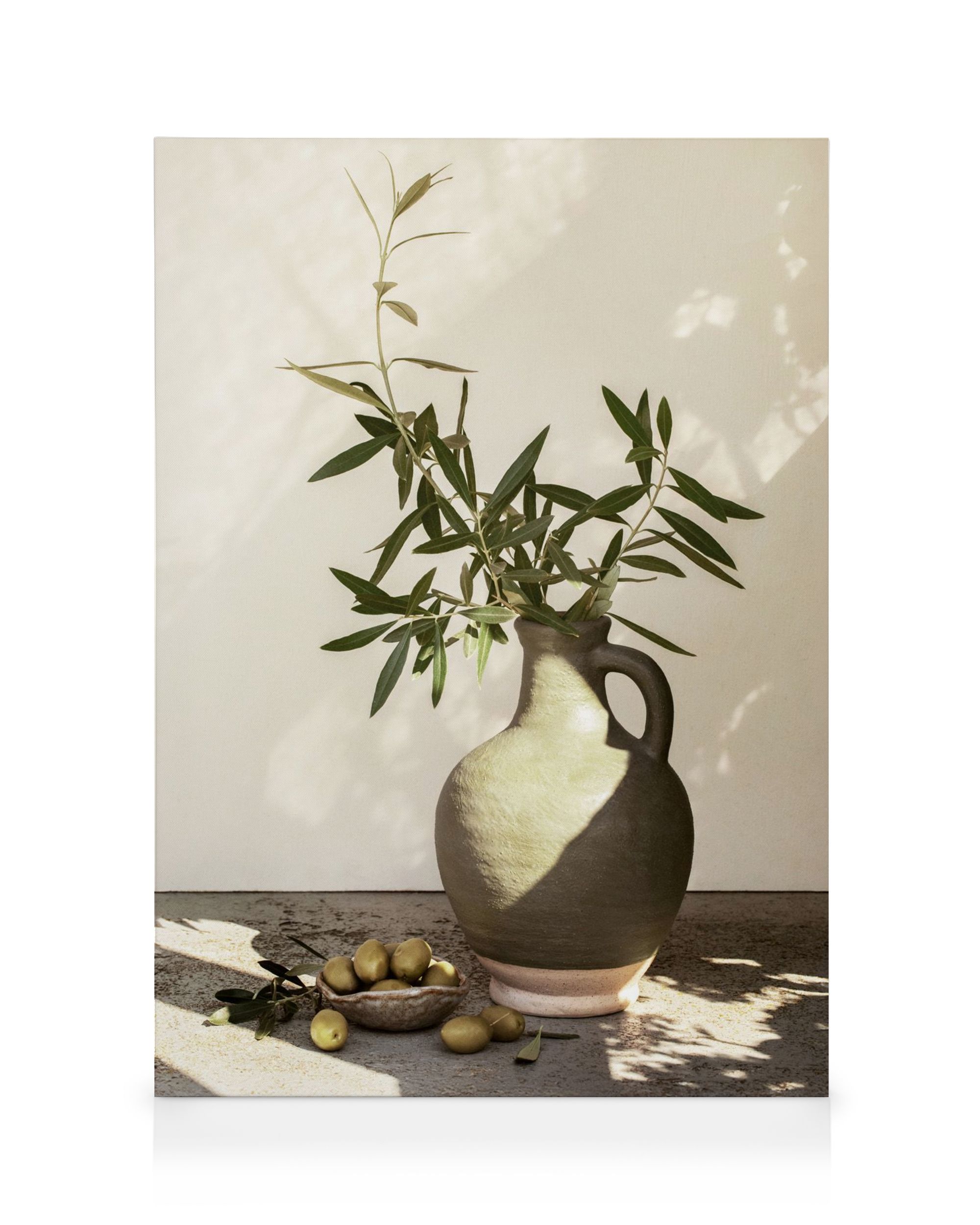 To lærreder, der viser grønne olivengrene i blødt sollys. Enkel og beroligende kunst til dit hjem.
